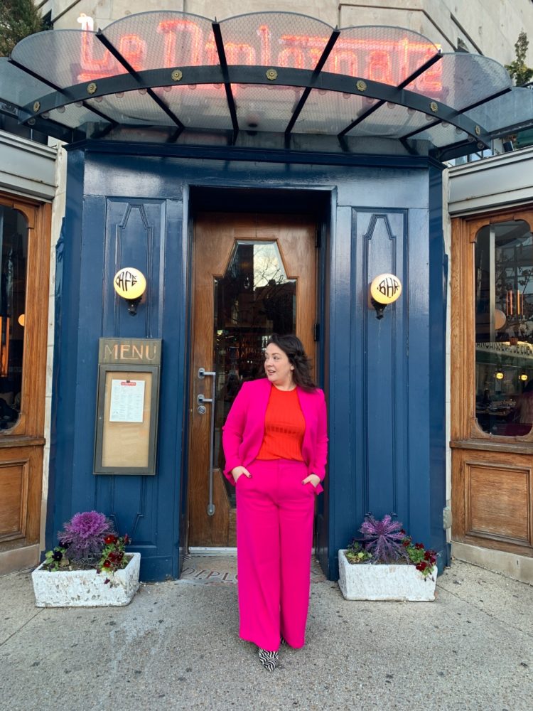 This is the same exact suit and sweater I wore in this blog post, I just switched out the shoes for my MIA sock booties that I've worn to death all fall and winter. The exact bootie I have is no longer available but DSW has one that unless you're looking at the top of the boot it is exactly the same. My friend hosted a lunch at Le Diplomate, a popular French restaurant in DC to celebrate the restaurant now offering lunch service on Fridays. I knew there would be photos taken, in fact I knew I'd be sharing the lunch on Instagram so I wanted to look cute but also be comfortable. As soon as I got there I removed the blazer because it was more casual but was glad to have it for photos. This was perfect, the shoes added pizazz and kept it from feeling corporate, the sweater is pretty on its own, and the pants are machine washable which is a good thing because I dropped part of my dessert in my lap! Neither the jacket nor the pants are still available in this color but they have more neutral colors available (they're from Banana Republic, both pieces are size 14 and sleeves and pants shortened by my tailor). The sweater is still available and on sale for $47. It's washable merino, not itchy, fitted without being too clingy for the office, and comes in a ton of other colors too. For this I purchased a size Large.